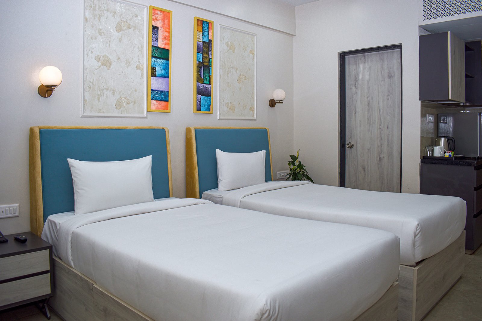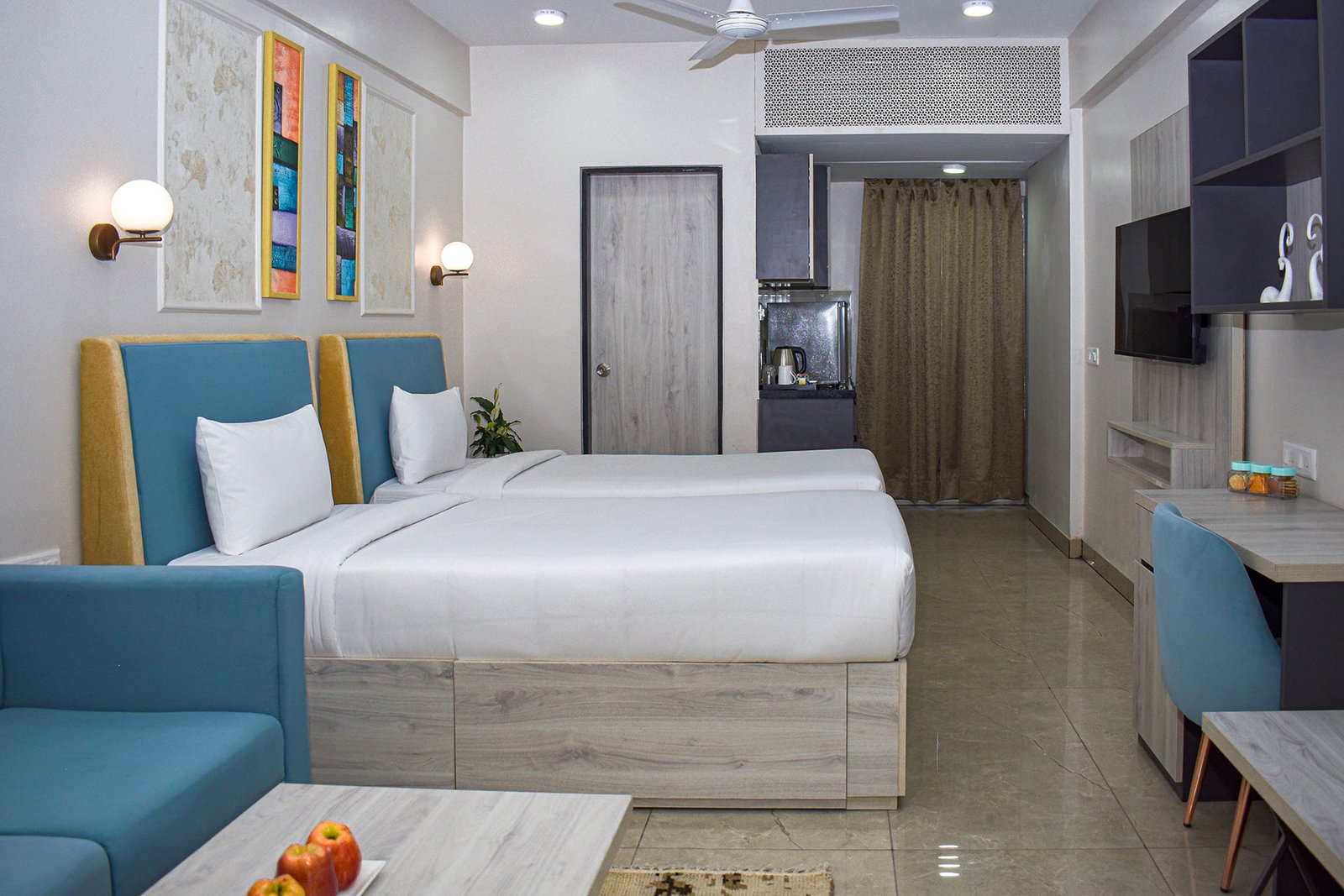 Modern twin-sharing hotel room in Jaipur with kitchenette, workspace and smart TV for comfortable extended stays.