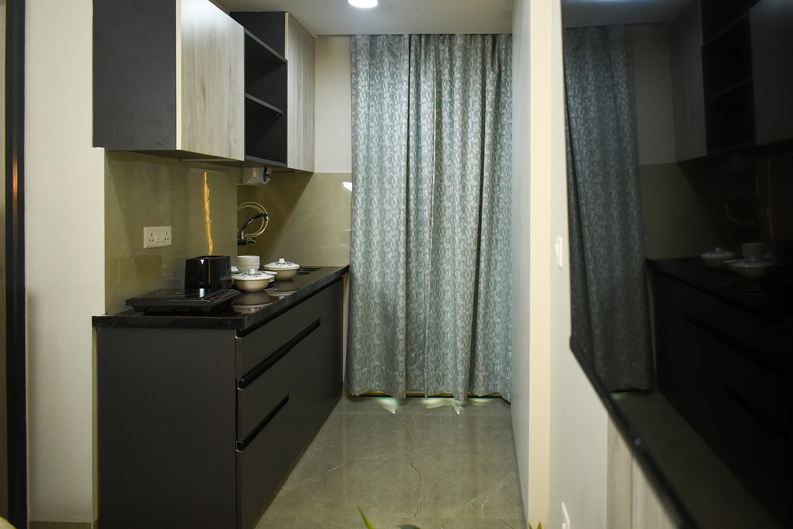 Fully equipped hotel kitchenette in Jaipur with induction cooktop, utensils and modern cabinets for extended comfortable stays.