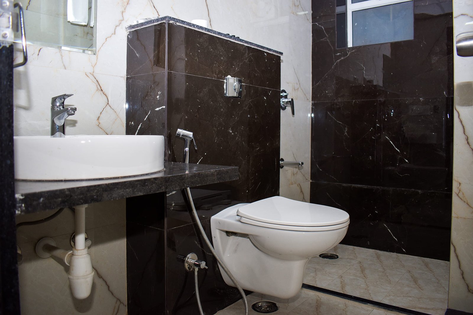 Elegant hotel bathroom in Jaipur with modern fittings, walk-in shower and premium marble walls for a luxurious stay.